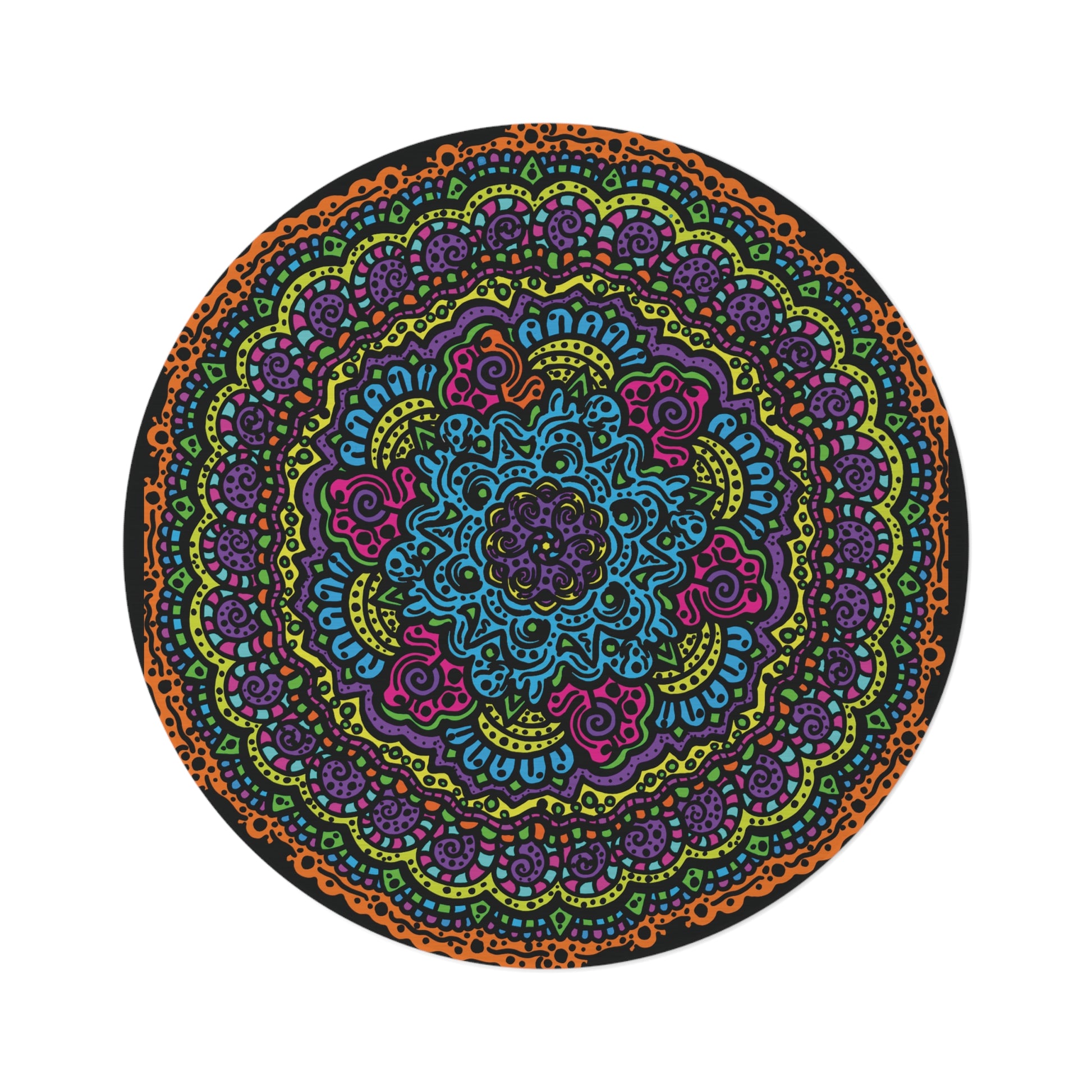 A round mandala rug with vibrant colors and a durable textured face. This inviting fabric is made of 100% Polyester chenille, resisting pilling and wrinkling. Perfect for adding a bohemian touch to your home decor.