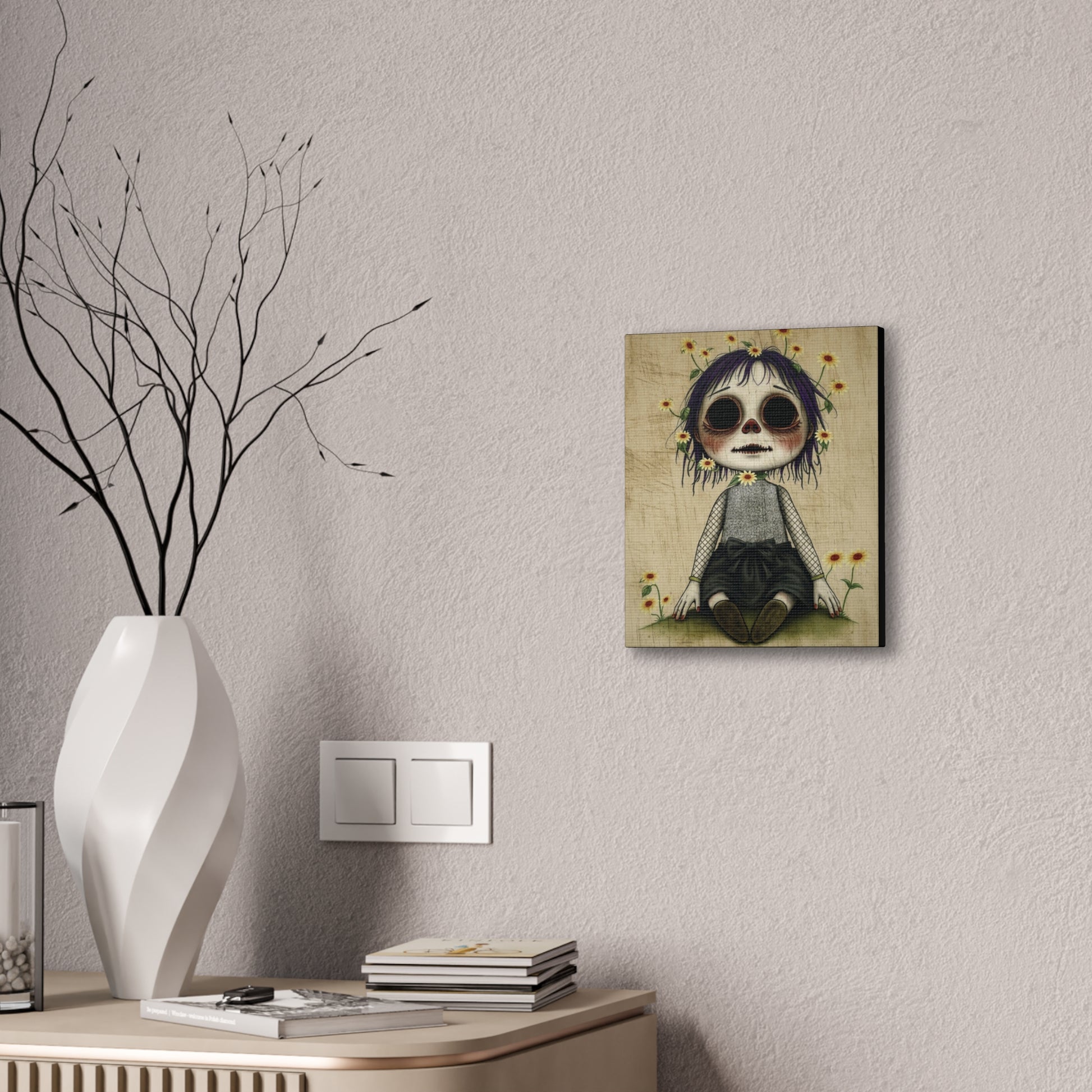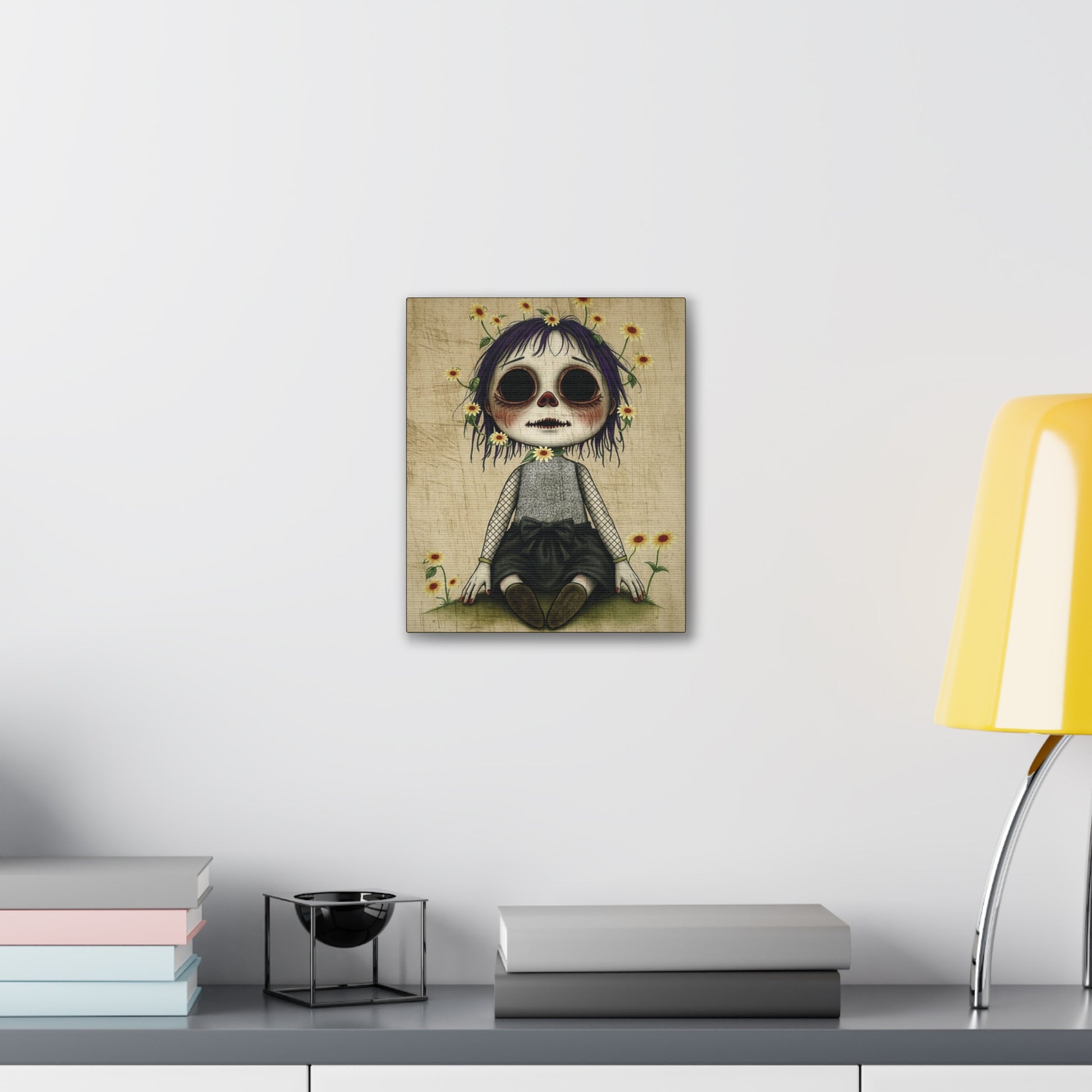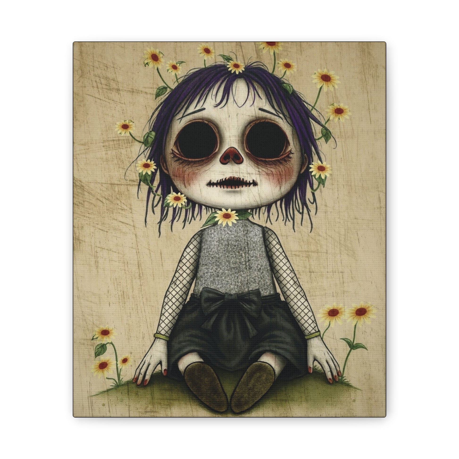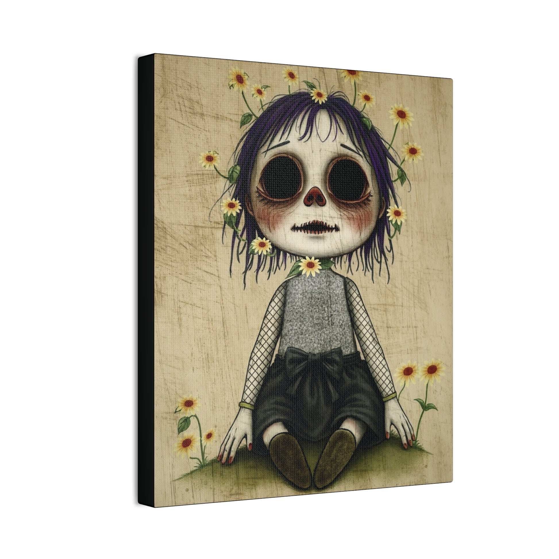 Sally doll stretched canvas is part of our spooky doll collection. She is a perfect addition to any spooky doll lover. This canvas is stretched over a .75" pinewood frame.